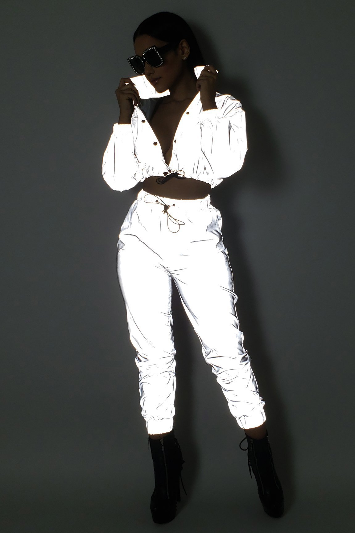 You glow girl. Turn heads in this sexy reflective 2 piece pant set.